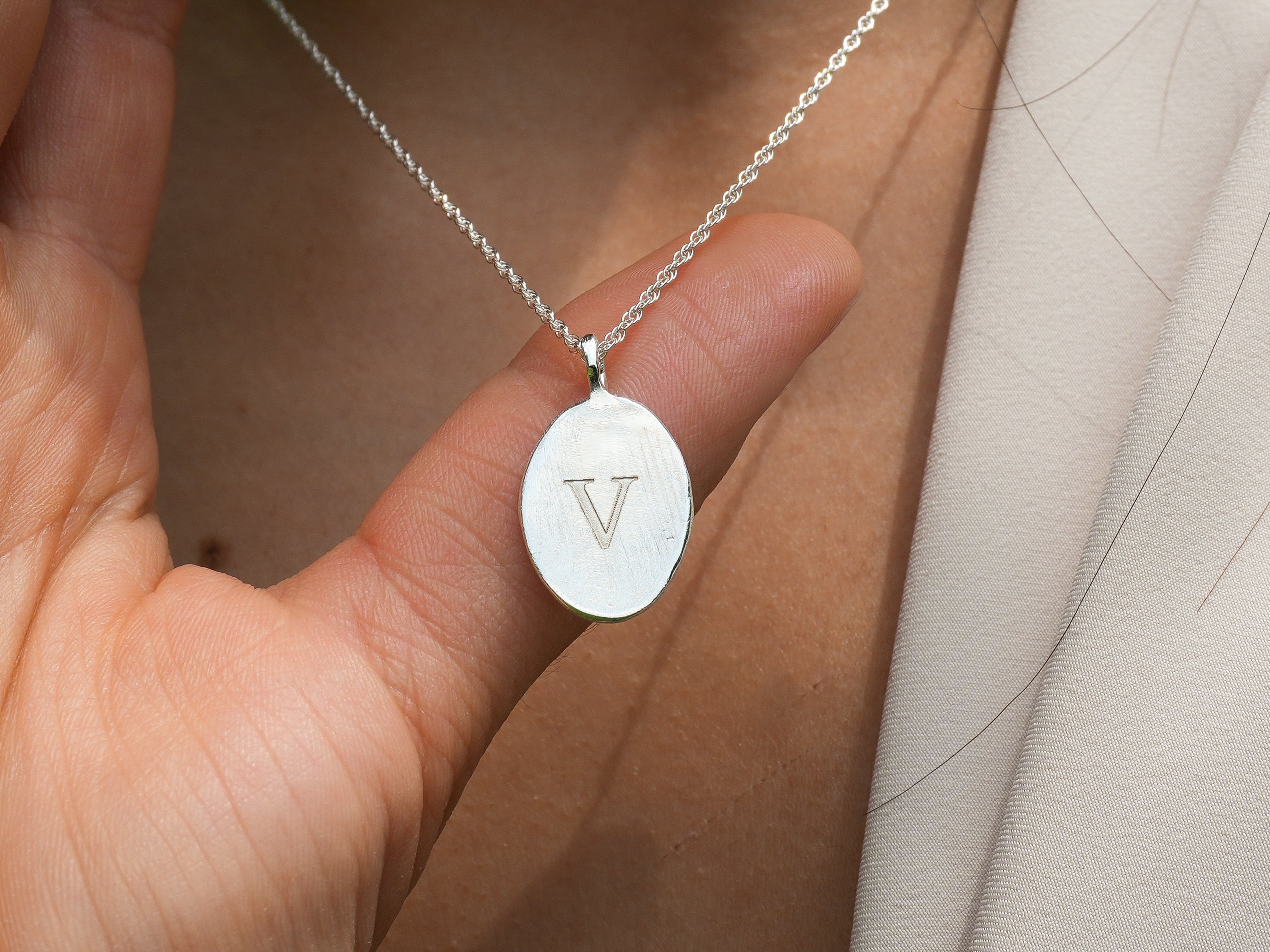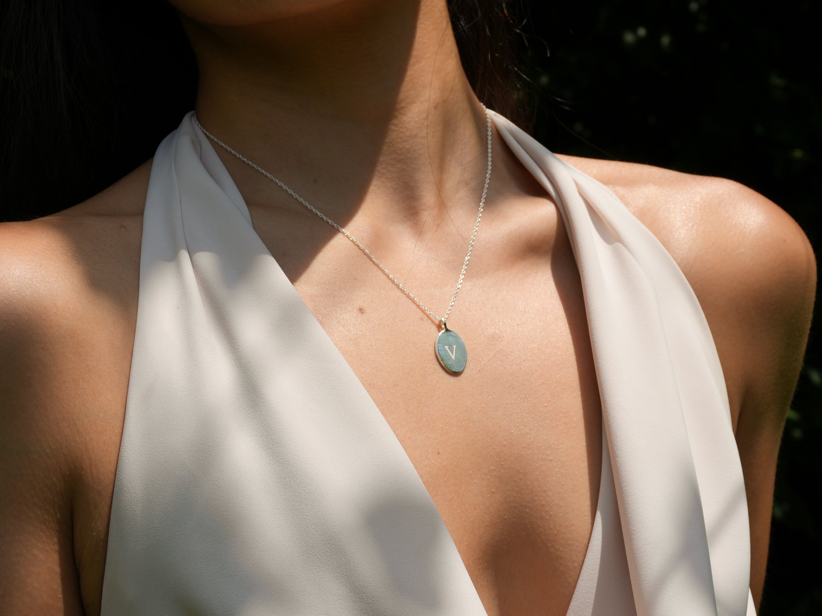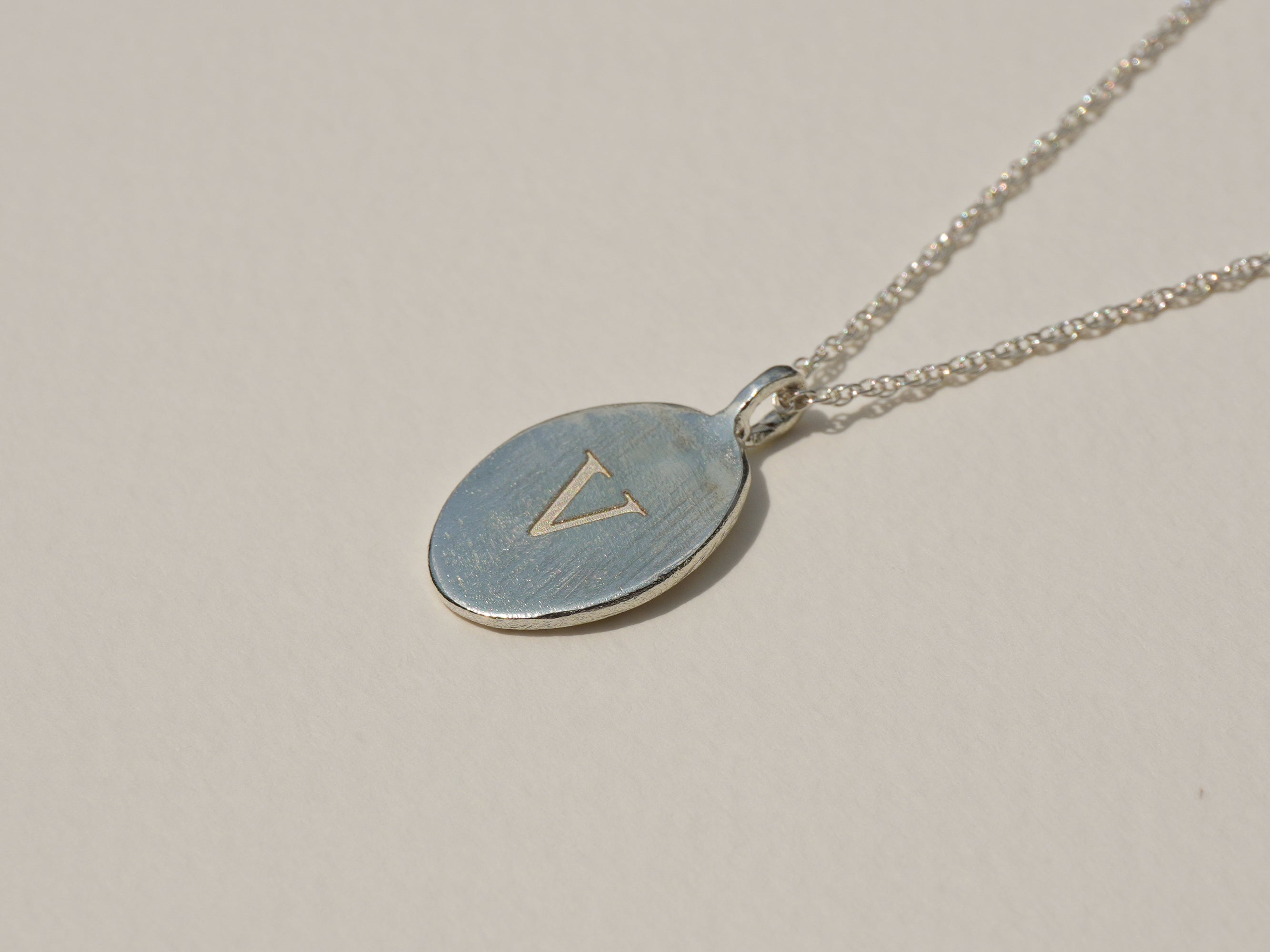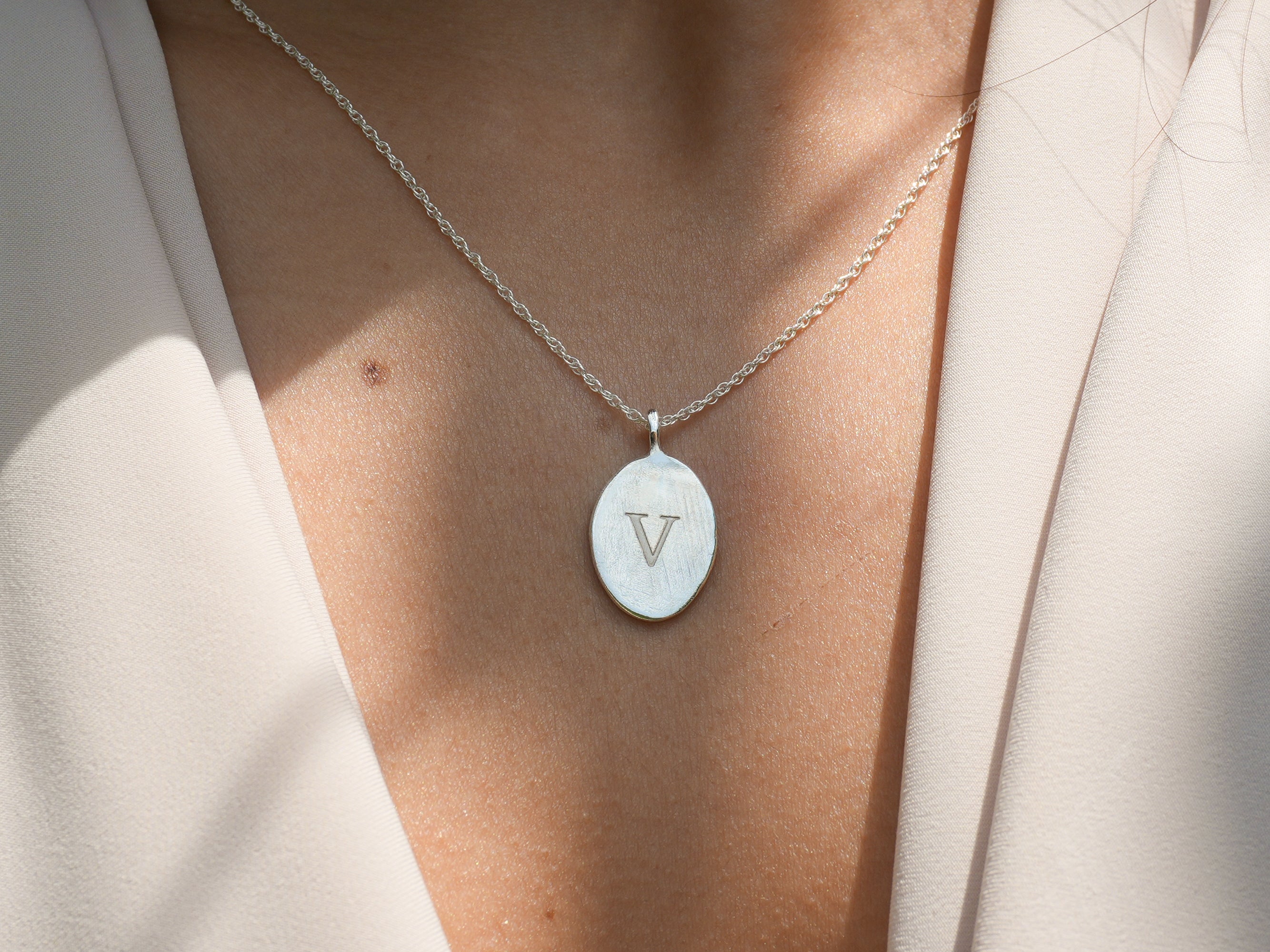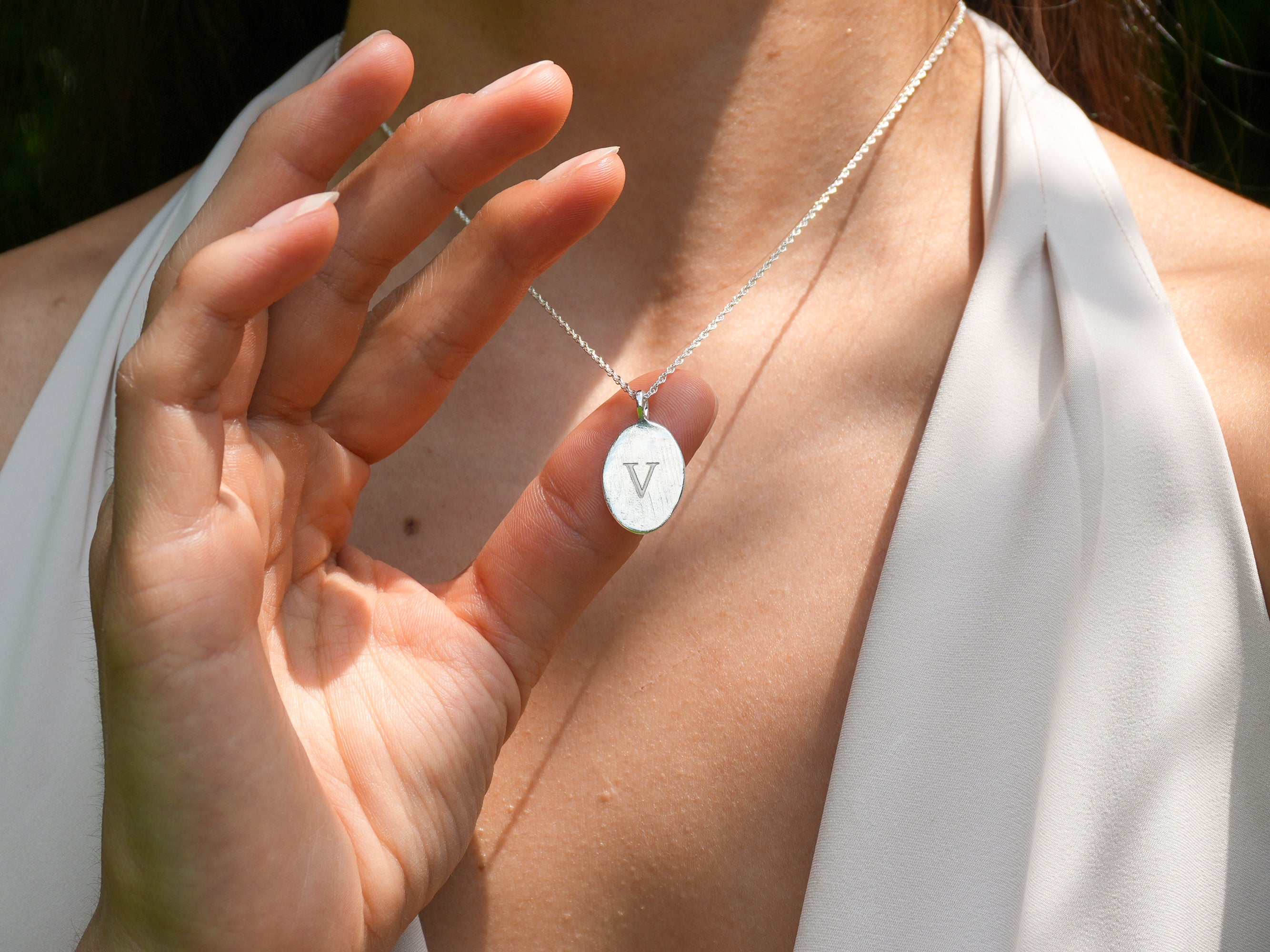 This hand-carved elegant oval engraved necklace has a minimalist silhouette and a subtle charm to it with it's unique handmade touch. Choose your letter of choice to make the perfect gift for yourself or for someone special.