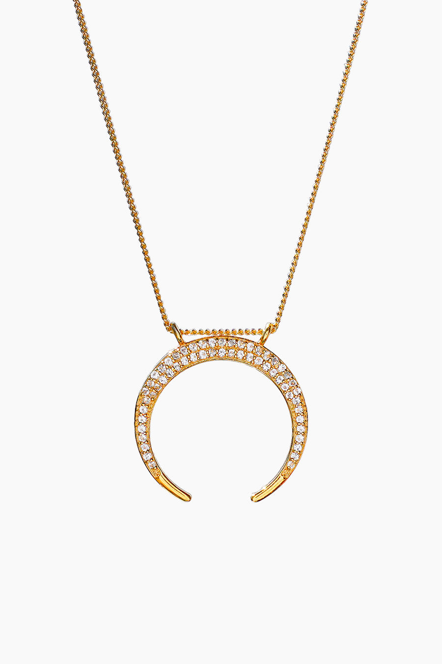 A gold crescent pavéd with brilliant white topaz that makes a spectacular centerpiece. This beautiful pendant sits harmoniously on a sleek and silky chain.
