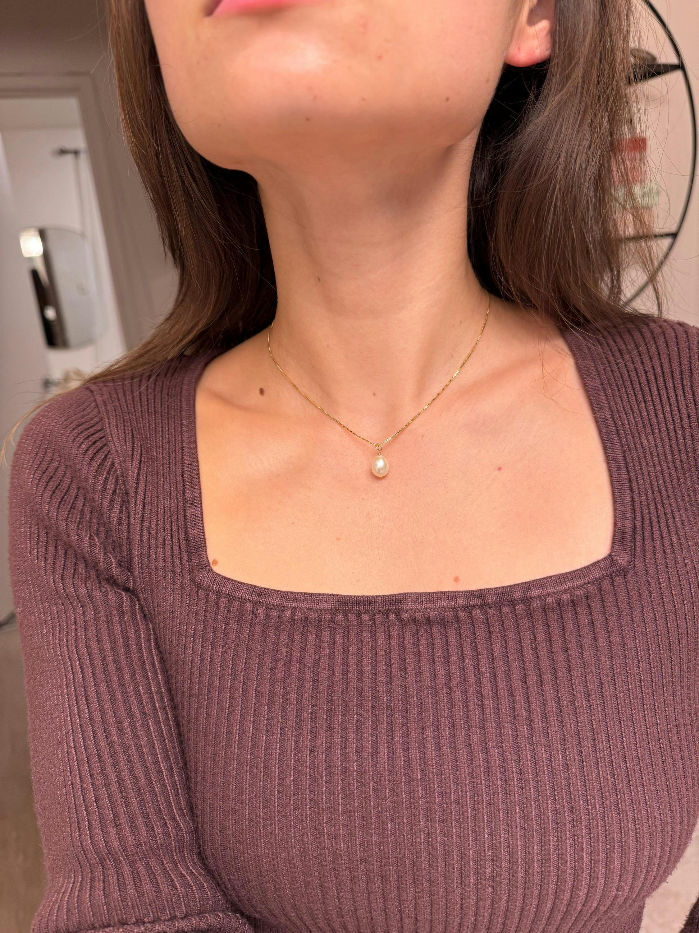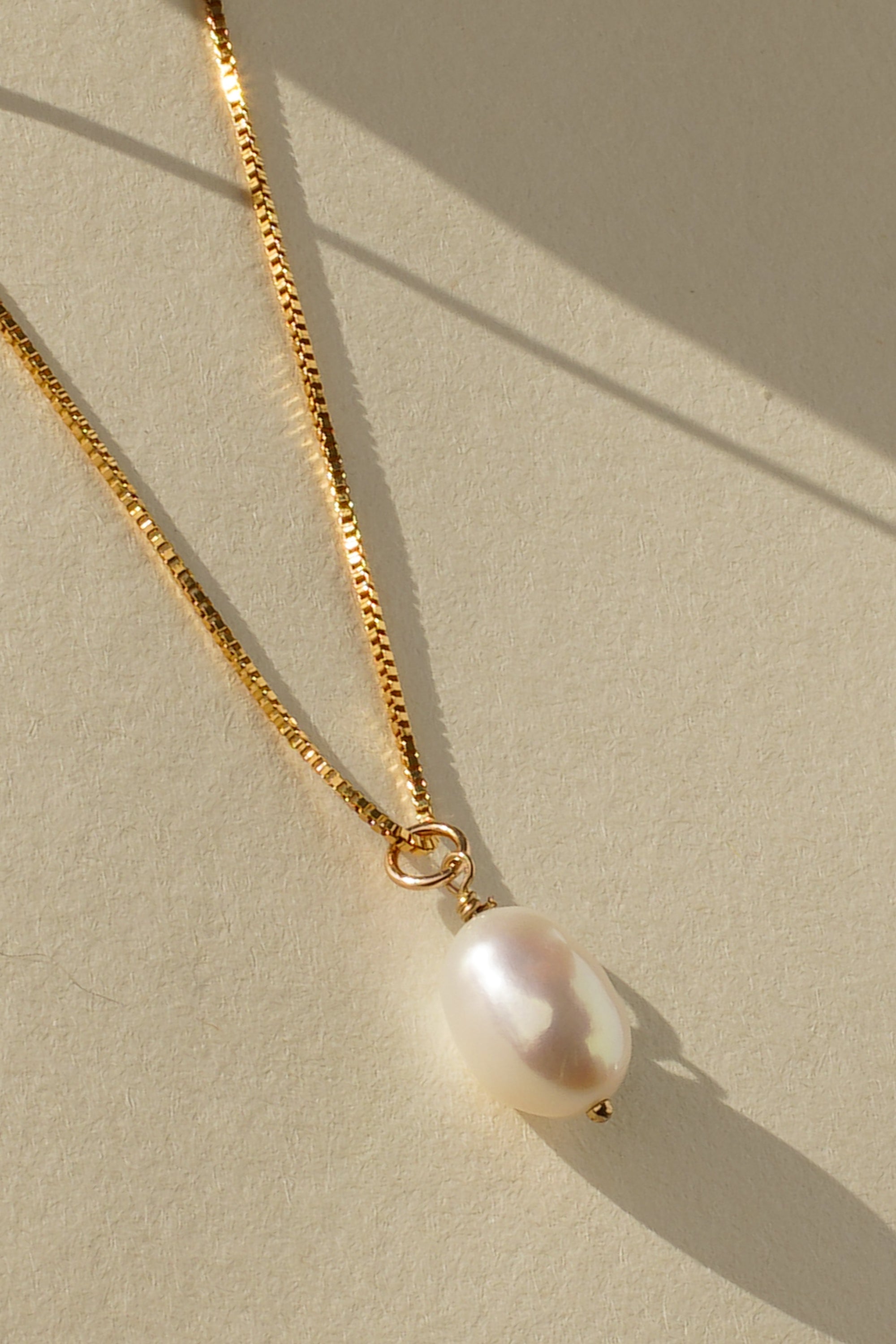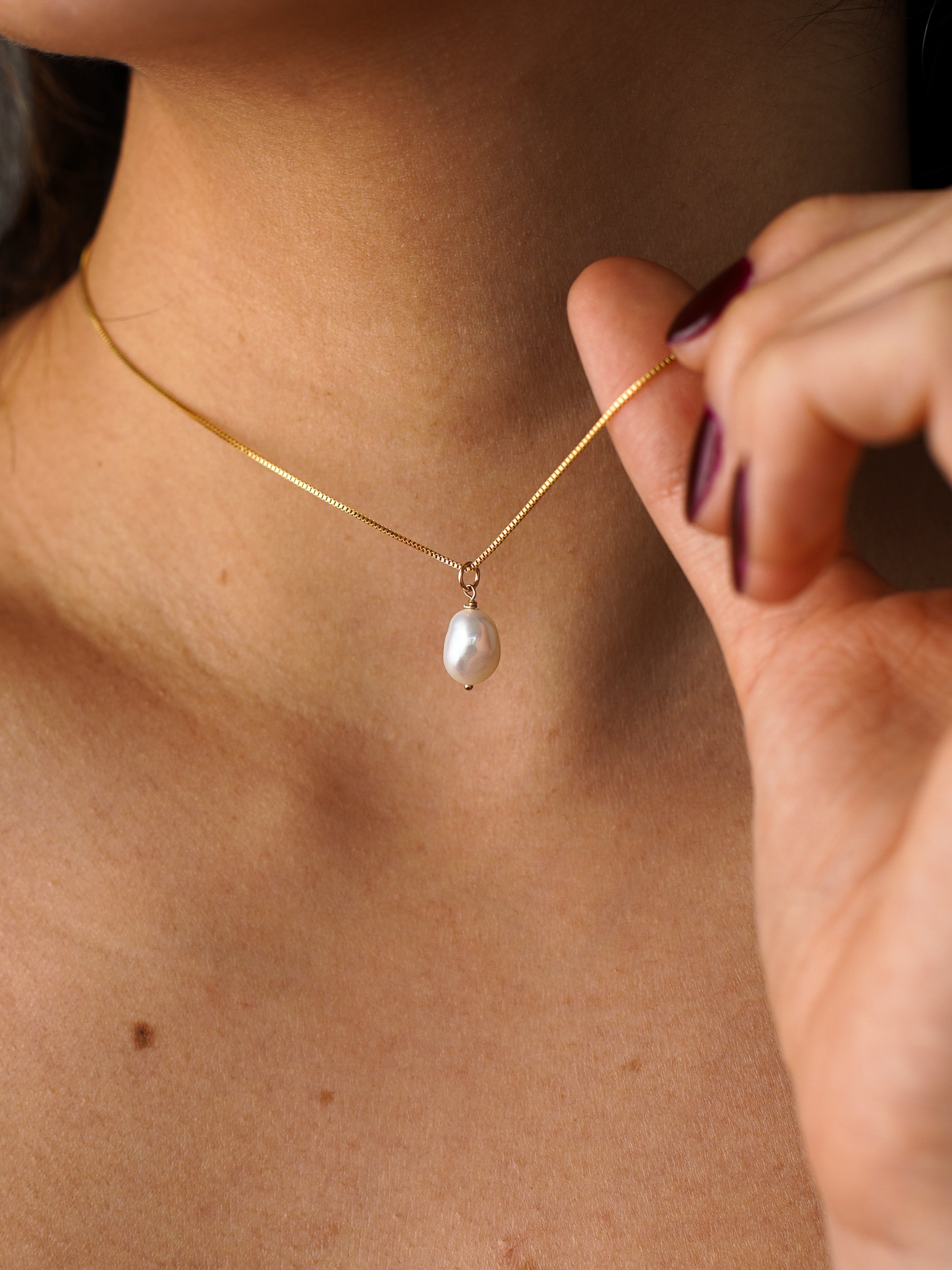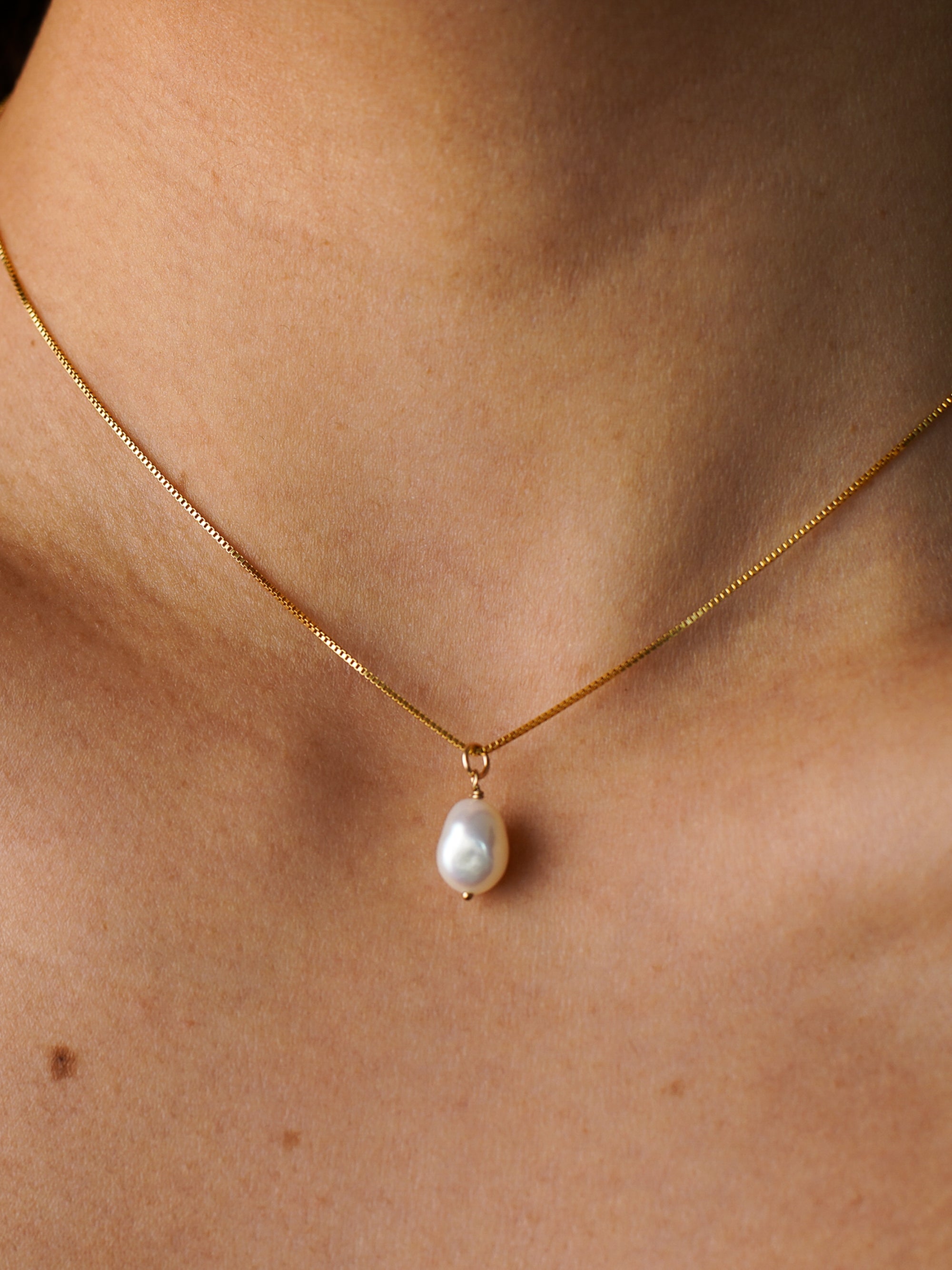 This classic pearl necklace is the cornerstone of any jewelry collection. A single luminous pearl, delicately suspended from a sleek, shimmering chain, catches the light with every movement. Perfect for adding understated sophistication to everyday wear or elevating a special occasion look.