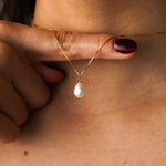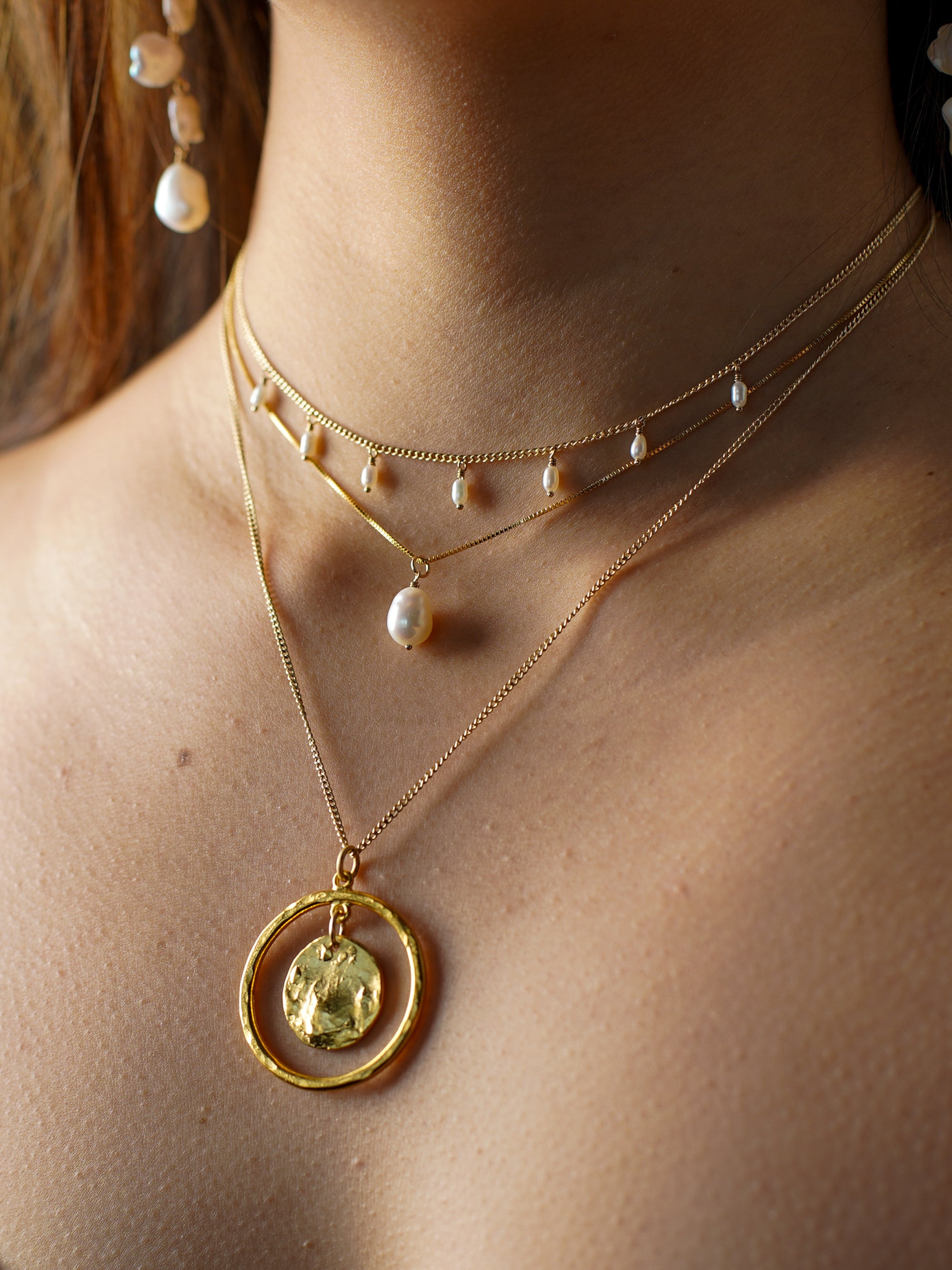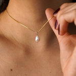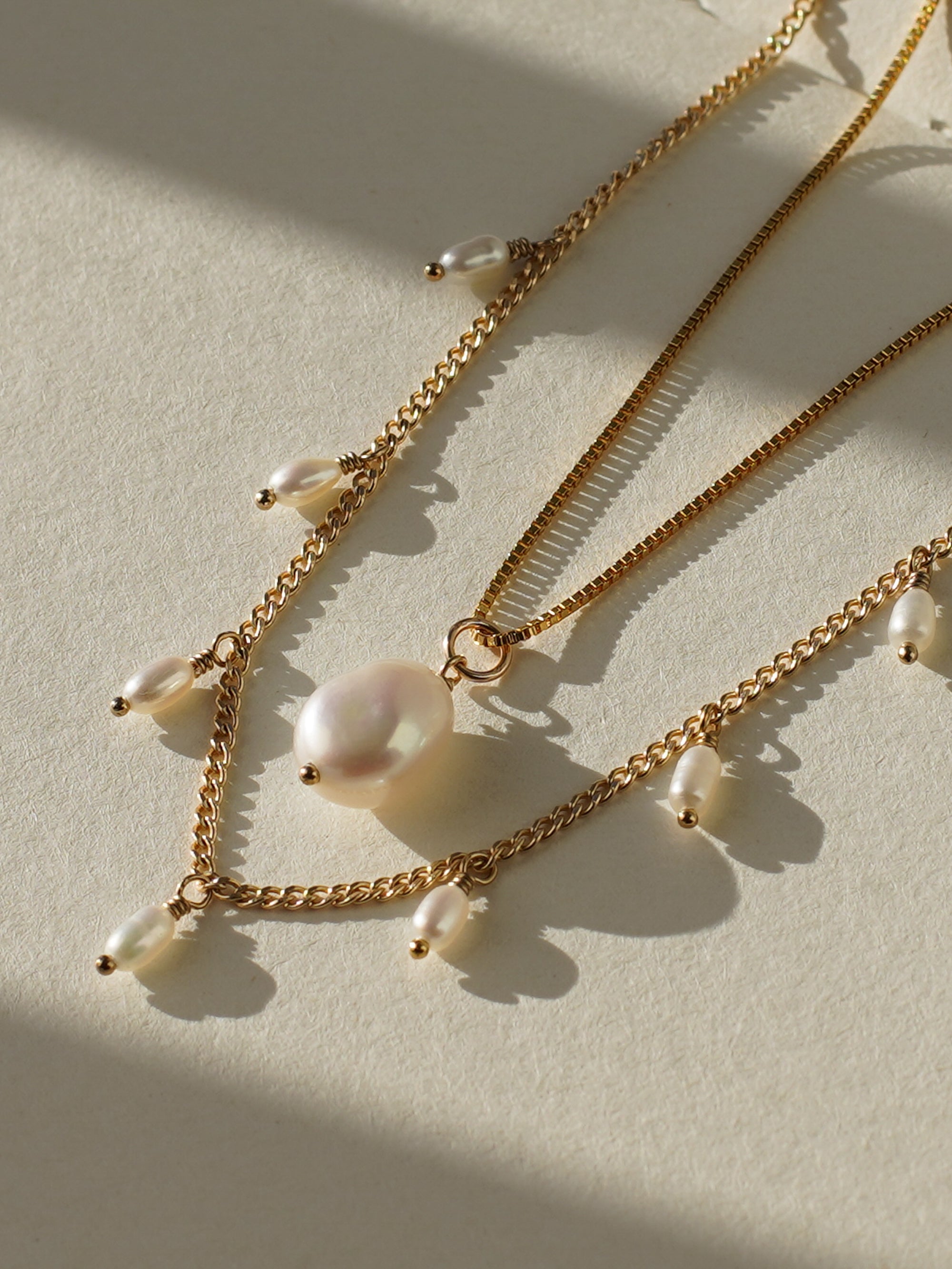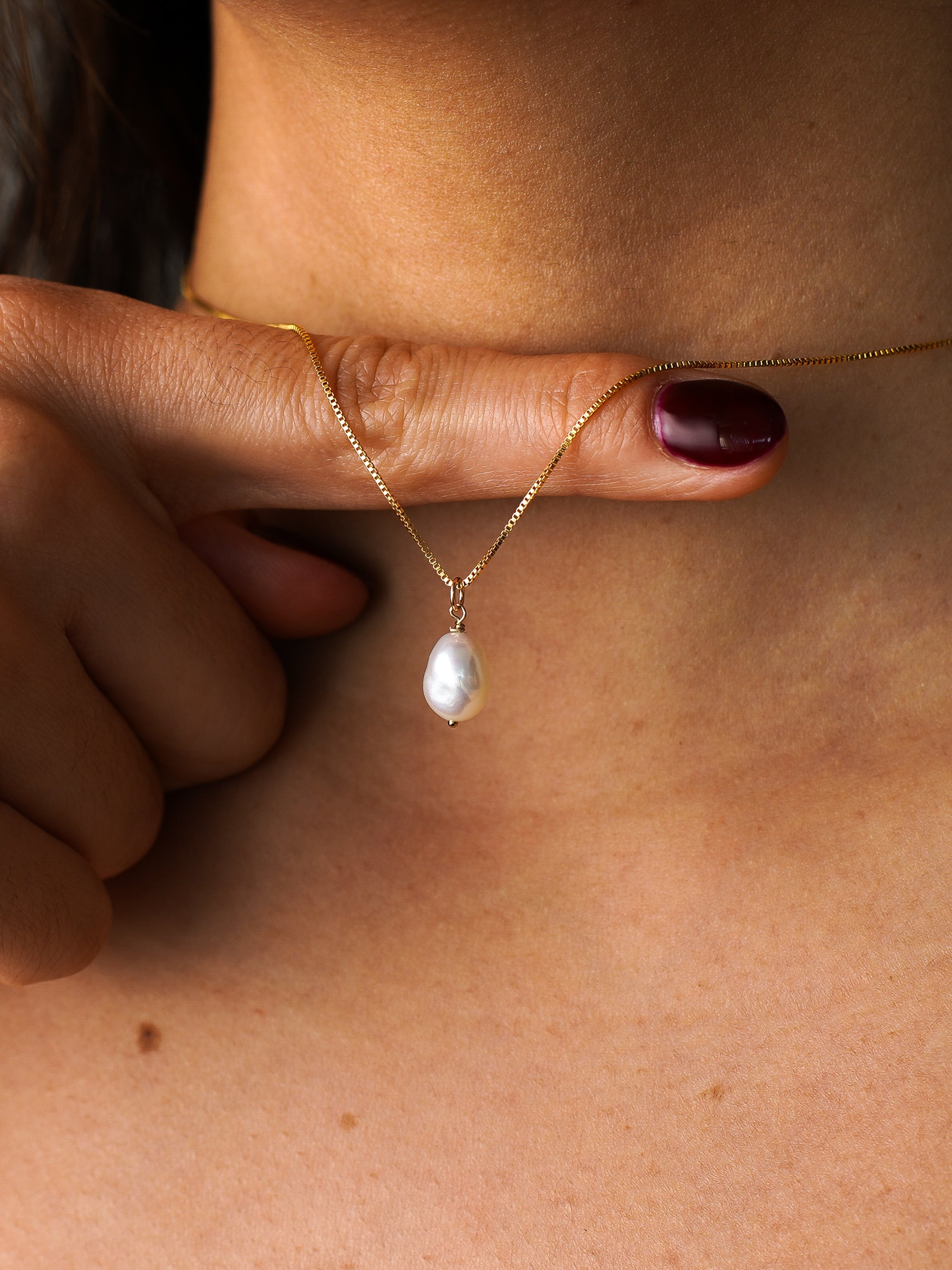 This classic pearl necklace is the cornerstone of any jewelry collection. A single luminous pearl, delicately suspended from a sleek, shimmering chain, catches the light with every movement. Perfect for adding understated sophistication to everyday wear or elevating a special occasion look.