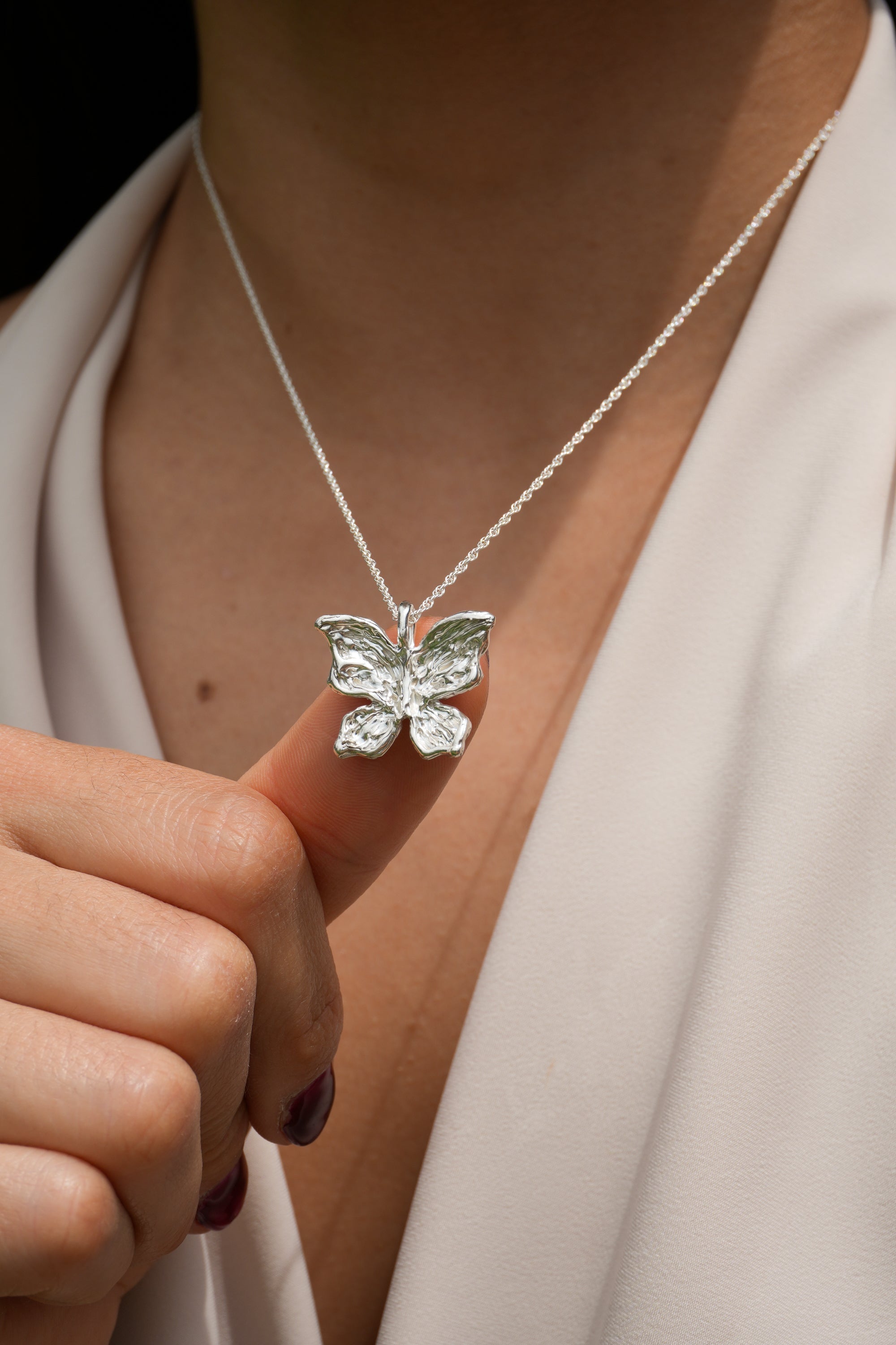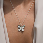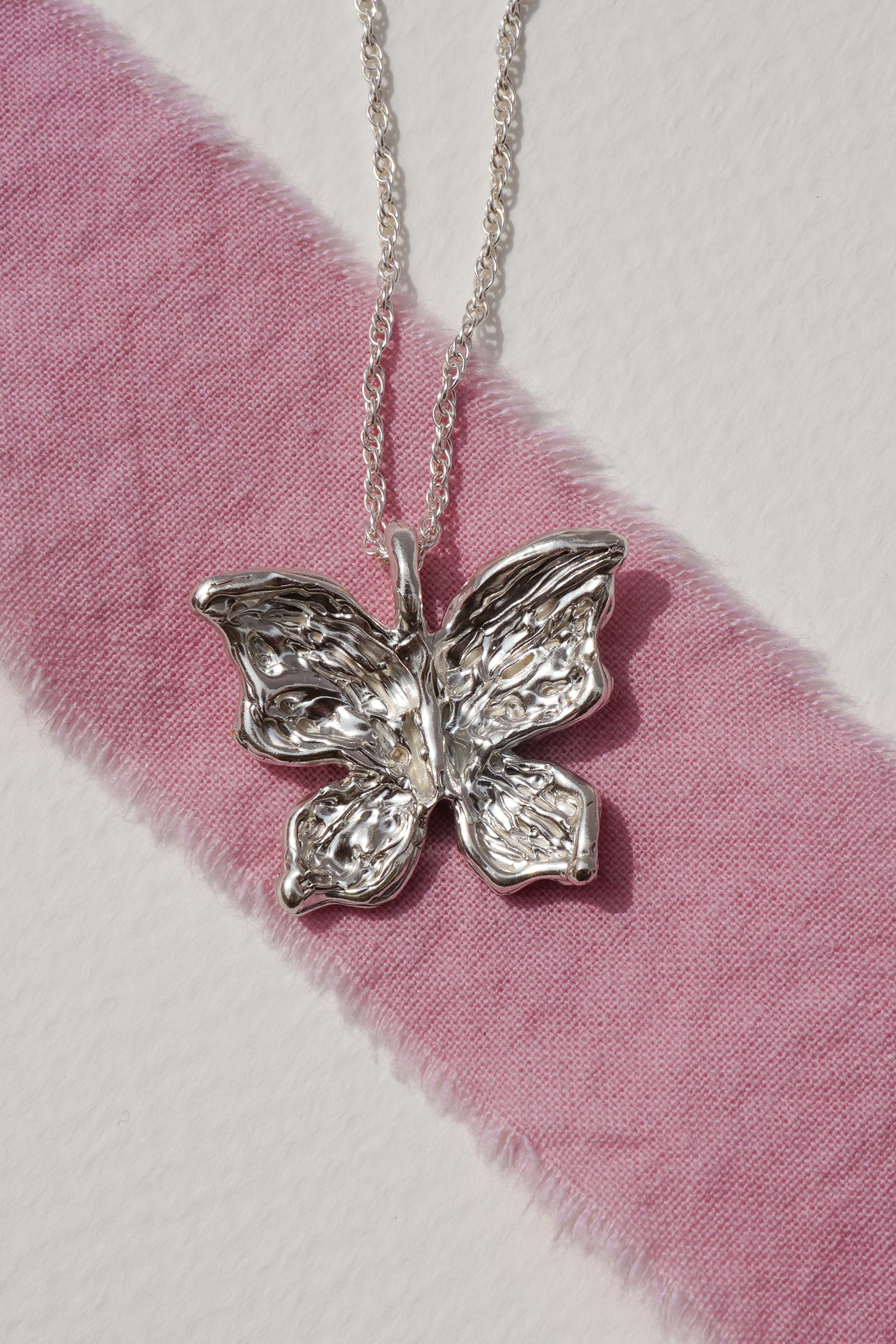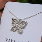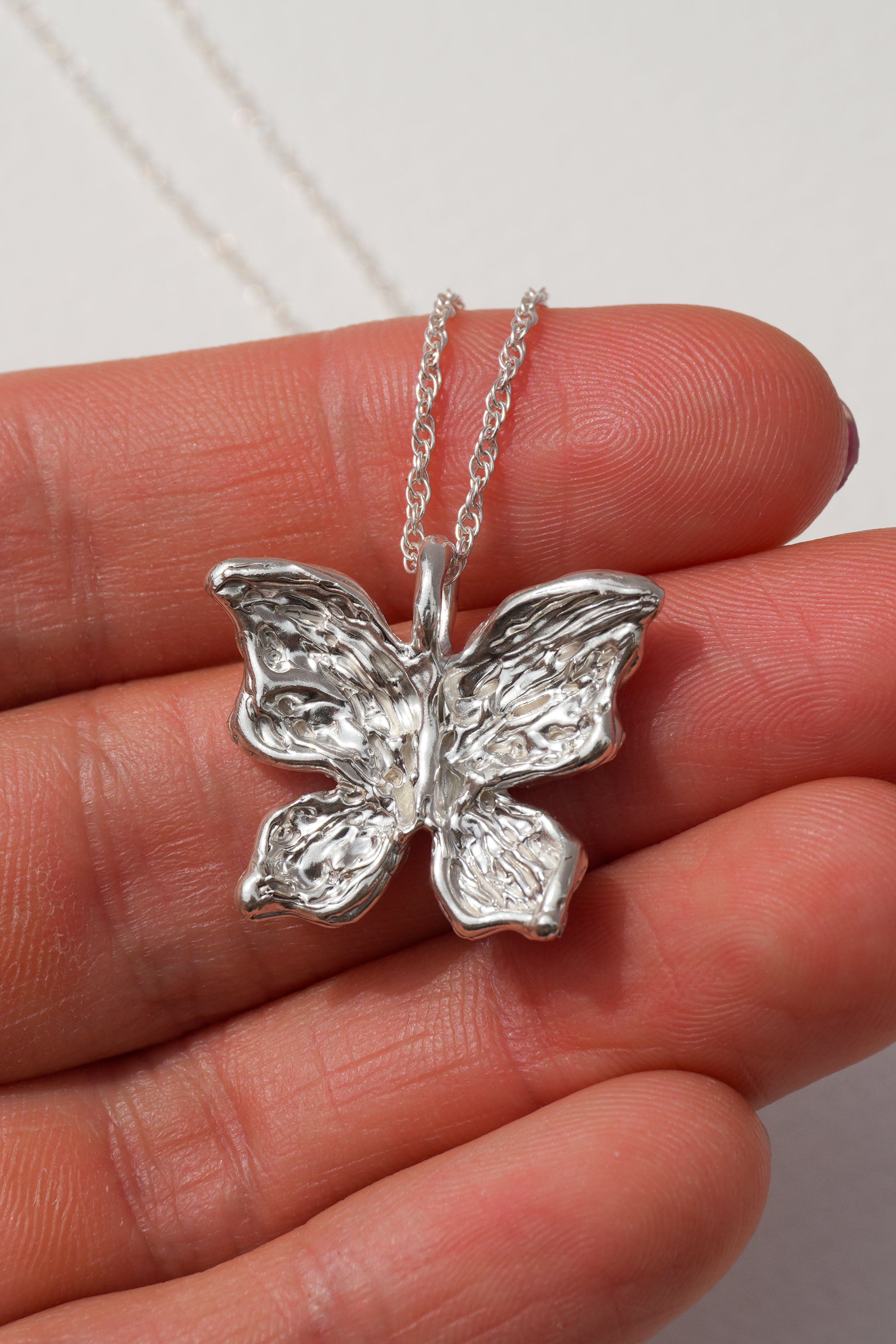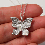 A delicate butterfly with intricately hand-carved wings, with textures like weathered pages, dents like well-loved doorframes, soft grooves that map the quiet collisions of living. Crafted in solid sterling silver, this necklace captures the beauty of gentle transformation, symbolizing growth, renewal, and the strength found in change. Wear it as a reminder of your own metamorphosis, or gift it to someone embracing a new chapter.