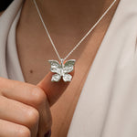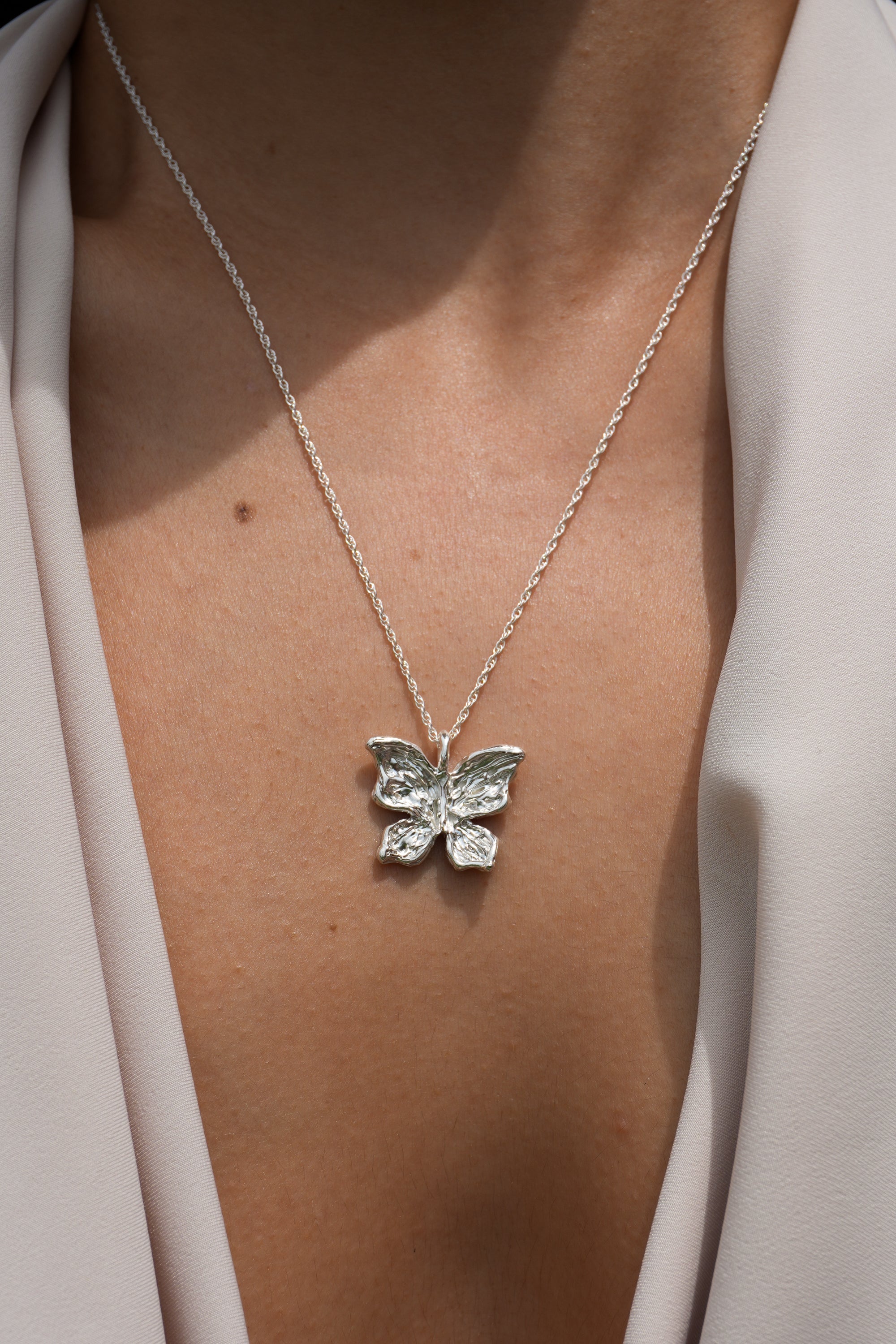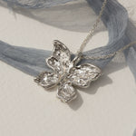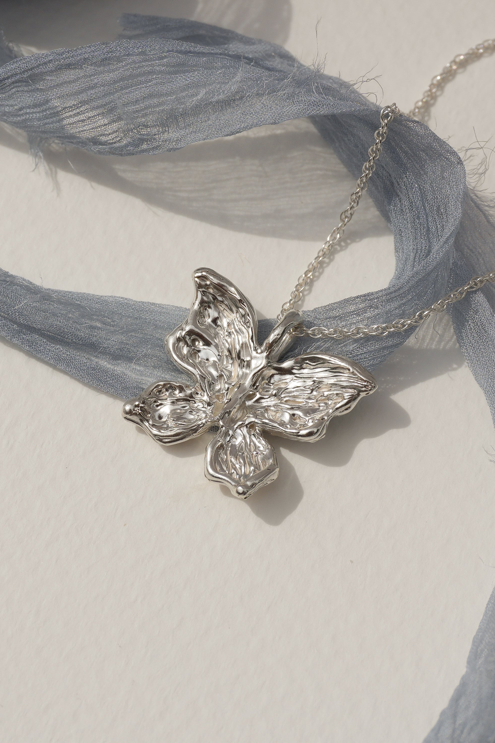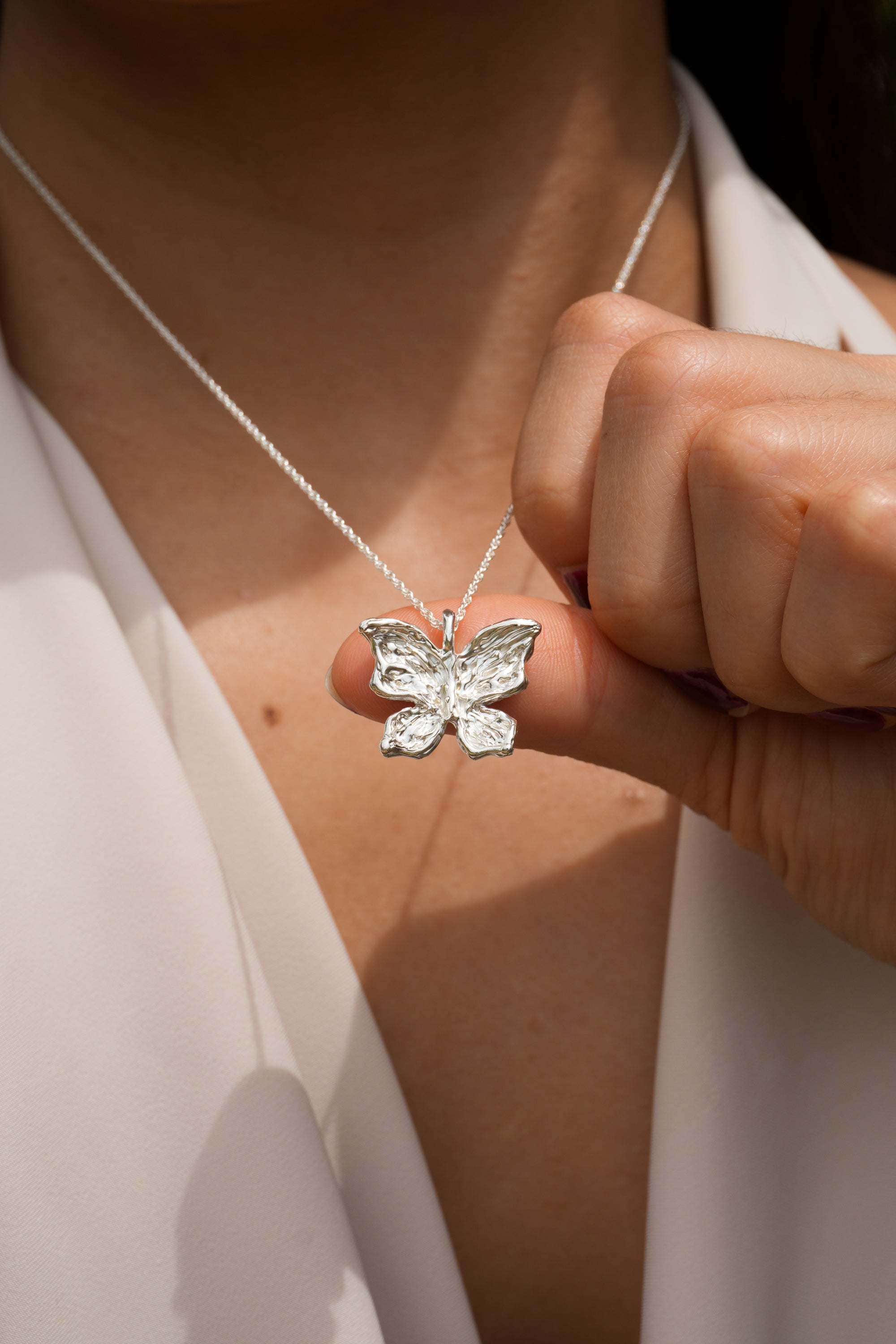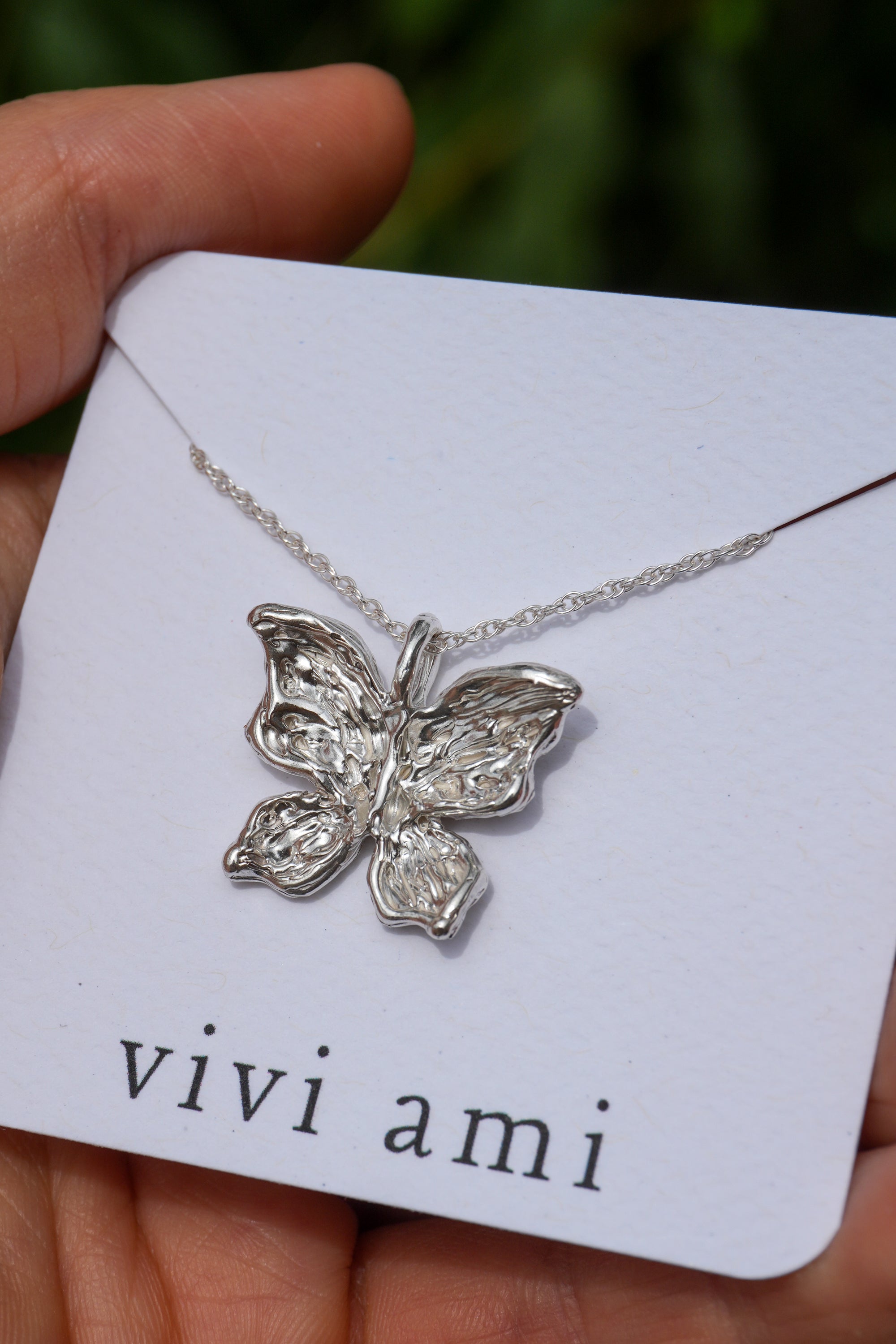 A delicate butterfly with intricately hand-carved wings, with textures like weathered pages, dents like well-loved doorframes, soft grooves that map the quiet collisions of living. Crafted in solid sterling silver, this necklace captures the beauty of gentle transformation, symbolizing growth, renewal, and the strength found in change. Wear it as a reminder of your own metamorphosis, or gift it to someone embracing a new chapter.