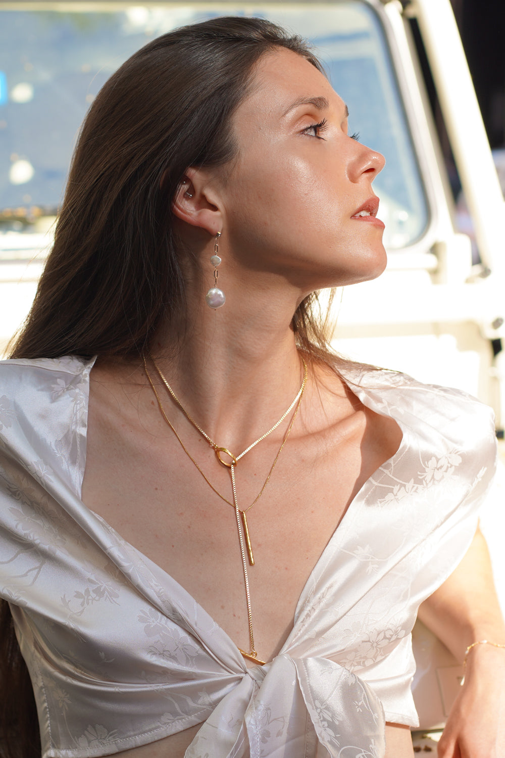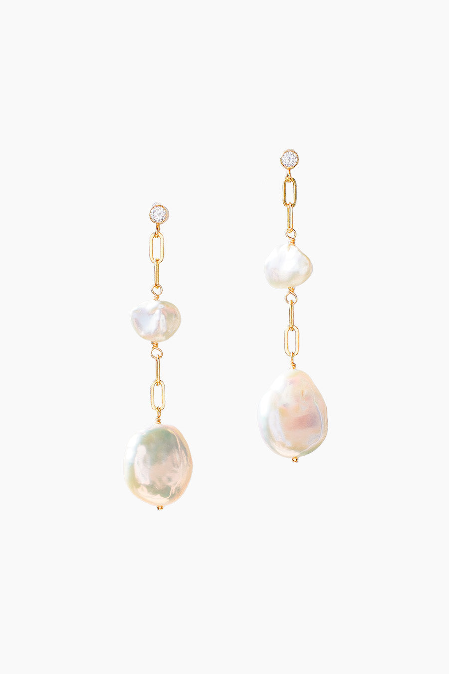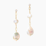 The Flor Earrings are inspired by the free flowing energy of water. With the irregular shaped baroque pearls connected by gold link chains, these earrings delicately flow and glimmer with every movement.