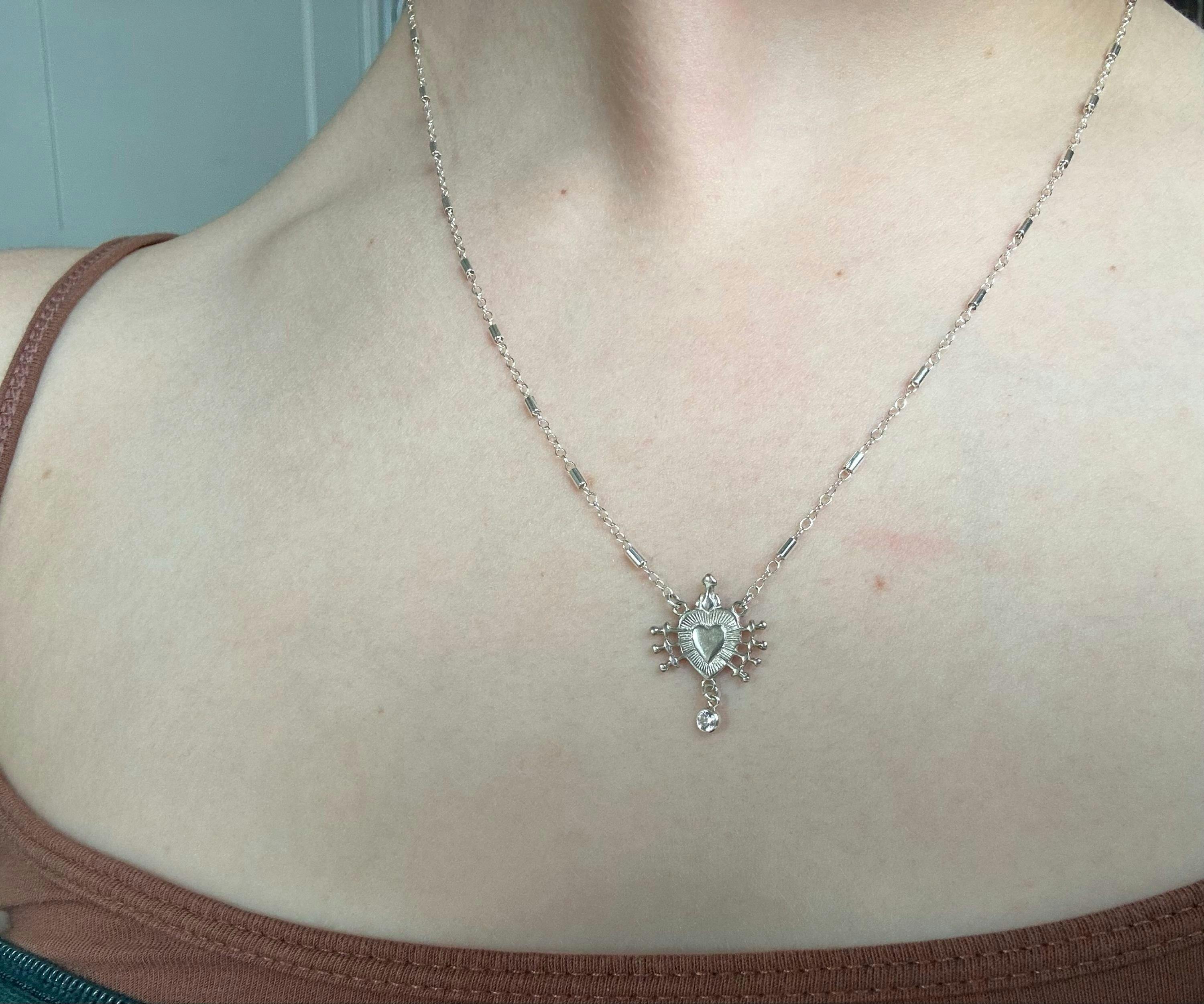 Features a dainty, beaded chain with a beautifully polished sacred heart finished with a drop of sparkle. This unique heart necklace is 14k gold filled and and features a cz diamond.
